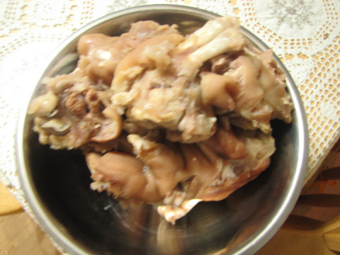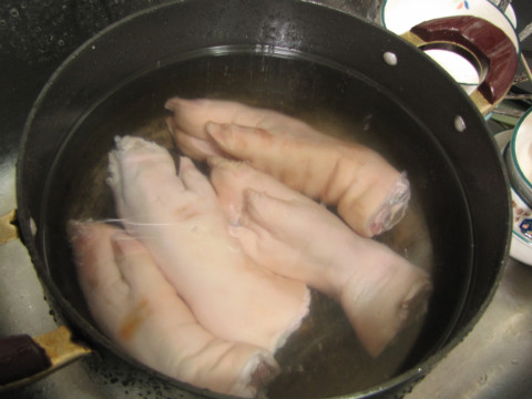 이후, 1시간정도 더 끓인후 족을 먼저 건져 냅니다. 족발집 족보다 좀더 풀어진 상태죠.