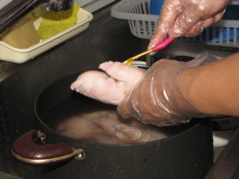 일단 핏물을 빼야겠지요. 1시간마다 물갈아주고 3시간정도 빼주었습니다.