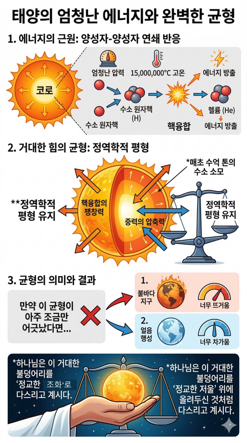 만약 이 균형이 아주 조금만 어긋났다면 지구는 불바다가 되거나 얼음 행성이 되었을 것이다. 하나님은 이 거대한 불덩어리를 '정교한 저울' 위에 올려두신 것처럼 다스리고 계시다.