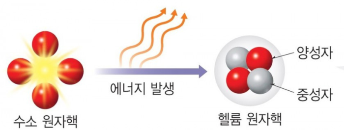 태양의 그 엄청난 에너지는 태양의 중심부에서는 수소 원자핵들이 엄청난 압력과 15,000,000°C에 달하는 고온 속에서 서로 충돌하여 헬륨으로 변하는 **'양성자-양성자 연쇄 반응(Proton-Proton Chain)'**이 일어난다.