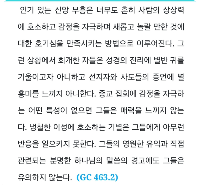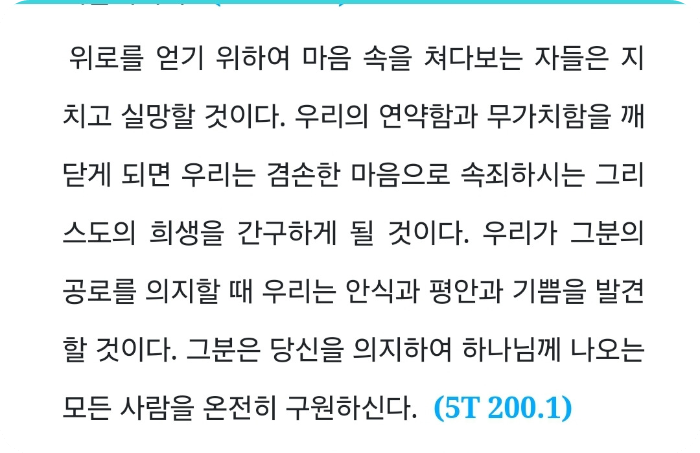 아! 이 것은 얼마나 가벼운지! 나는 이 사실을 내가 본대로 진술할 수는 있지만, 저울을 가지고 하나님의 백성들의 생각과 관심을 달아보는 천사를 보는 때, 내 마음에 받은 그 엄숙하고 생생한 인상은 결코 표현할 수가 없다. 천사는 말하기를 ‘이러한 사람들이 하늘에 들어갈 수 있겠는가? 아니다. 아니다. 결코 아니다. 그들이 지금 가지고 있는 소망은 헛된 소망이니 그들이 속히 회개하고 구원을 얻지 못하면 그들은 멸망을 당할 수 밖에 없다고 말하라’ 하였다.」 (1T, 124, 125)