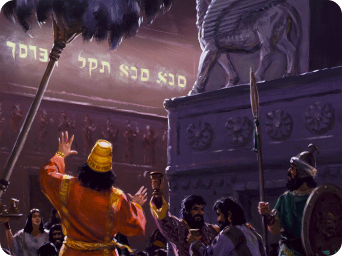“그 때에 사람의 손가락들이 나타나서 왕궁 촛대 맞은편 석회벽에 글자를 쓰는데 왕이 그 글자 쓰는 손가락을 본지라 이에 왕의 즐기던 얼굴 빛이 변하고 그 생각이 번민하여 넓적다리 마디가 녹는 듯하고 그의 무릎이 서로 부딪친지라 왕이 크게 소리 질러 술객과 갈대아 술사와 점쟁이를 불러오게 하고 바벨론의 지혜자들에게 말하되 누구를 막론하고 이 글자를 읽고 그 해석을 내게 보이면 자주색 옷을 입히고 금사슬을 그의 목에 걸어 주리니 그를 나라의 셋째 통치자로 삼으리라 하니라”(단 5:5-7)