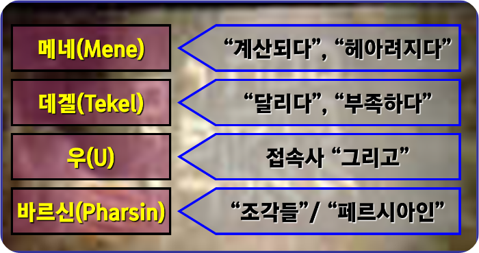 “기록된 글자는 이것이니 곧 메네 메네 데겔 우바르신이라 그 글을 해석하건대 메네는 하나님이 이미 왕의 나라의 시대를 세어서 그것을 끝나게 하셨다 함이요 데겔은 왕을 저울에 달아 보니 부족함이 보였다 함이요 베레스는 왕의 나라가 나뉘어서 메대와 바사 사람에게 준 바 되었다 함이니이다 하니”(단 5:25-28)