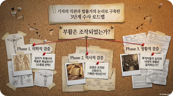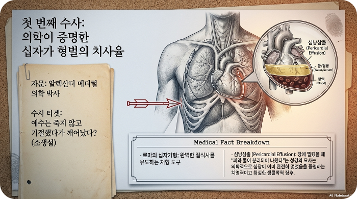 하지만 돌아온 답변은 냉혹했다. 로마의 채찍질은 살점을 뜯어내고 내장을 드러내게 하는 잔혹한 고문이었으며, 십자가형은 질식사를 유도하는 완벽한 처형 도구였다는 것이다. 창에 찔렸을 때 피와 물이 분리되어 나왔다는 성경의 기록은 의학적으로 '심낭삼출'을 의미하며, 이는 이미 심장이 멎었음을 증명하는 확실한 징후였다. 리의 첫 번째 화살은 빗나갔다. 예수는 확실히 죽었다.