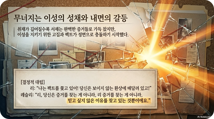 레슬리는 눈물을 흘리며 대답했다. "리, 당신은 증거를 찾는 게 아니라, 믿고 싶지 않은 이유를 찾고 있는 것뿐이에요."