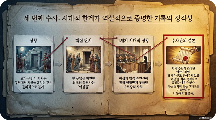 그는 마지막 희망을 걸고 '빈 무덤'에 대해 조사했다. 하지만 로마 군인들이 지키던 무덤에서 시신을 훔치는 것은 불가능에 가까웠고, 여인들이 처음으로 목격자로 등장한다는 점(당시 여성의 증언권이 없던 시대상을 고려할 때 조작된 이야기라면 결코 넣지 않았을 설정)은 오히려 성경 기록의 정직함을 뒷받침했다.
