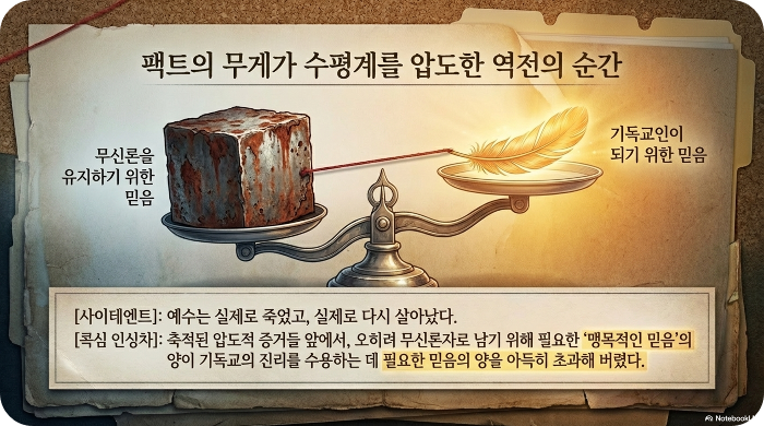 그는 깨달았다. 자신이 무신론자로 남기 위해 필요한 '믿음'의 양이, 기독교인이 되기 위해 필요한 '믿음'의 양보다 훨씬 더 커져 버렸다는 사실을. 증거의 무게가 이미 무신론의 수평계를 압도해 버린 것이다.