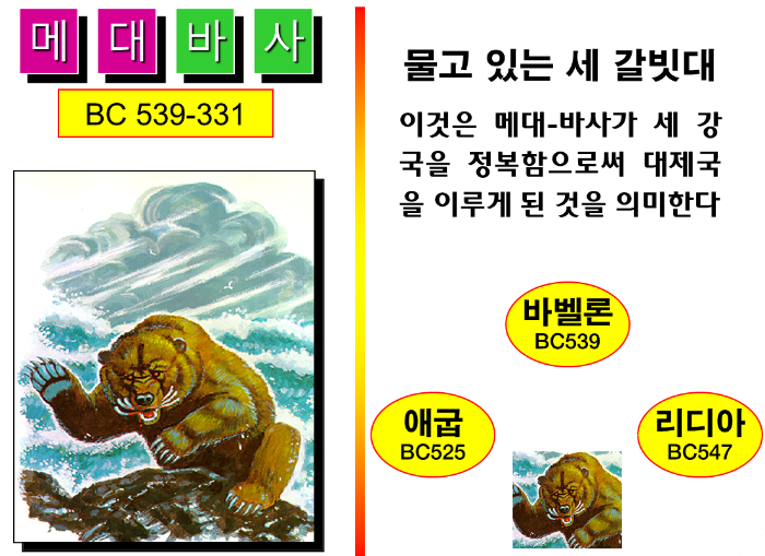 그리고 곰이 “세 갈빗대를 물었다”는 것은 이 나라가 적어도 세 나라를 정복할 것을 예언하고 있습니다. 그 예언한 대로 정확하게 페르시아 나라는 547년에 리디아, 539년에 바벨론, 525년에 이집트 나라를 정복하게 됩니다.