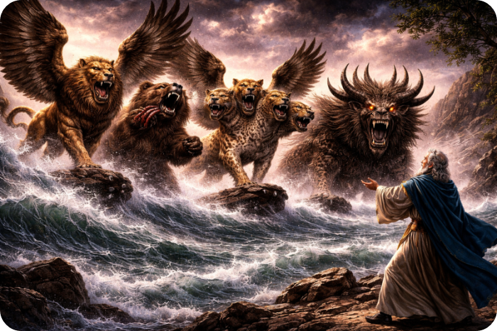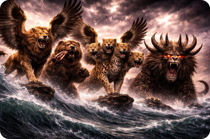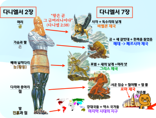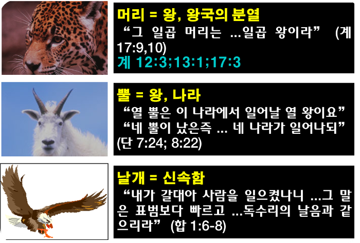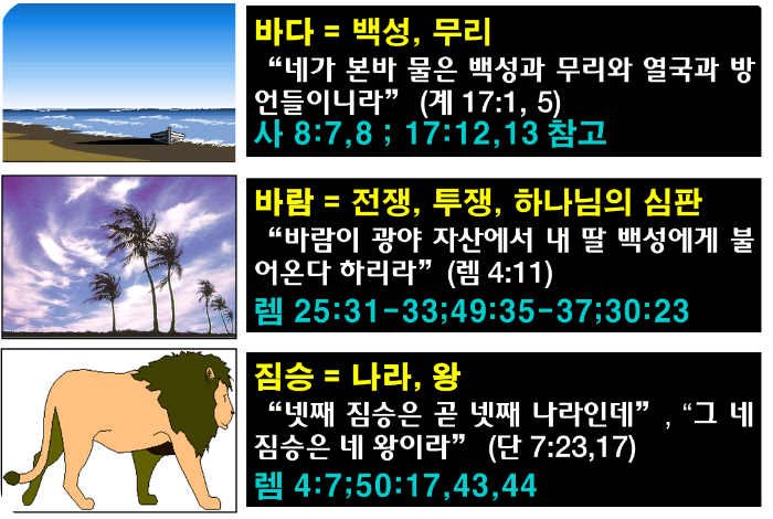 (단 7:2-8) “[2] 다니엘이 진술하여 이르되 내가 밤에 환상을 보았는데 하늘의 네 바람이 큰 바다로 몰려 불더니 [3] 큰 짐승 넷이 바다에서 나왔는데 그 모양이 각각 다르더라 [4] 첫째는 사자와 같은데 독수리의 날개가 있더니 내가 보는 중에 그 날개가 뽑혔고 또 땅에서 들려서 사람처럼 두 발로 서게 함을 받았으며 또 사람의 마음을 받았더라 [5] 또 보니 다른 짐승 곧 둘째는 곰과 같은데 그것이 몸 한쪽을 들었고 그 입의 잇사이에는 세 갈빗대가 물렸는데 그것에게 말하는 자들이 있어 이르기를 일어나서 많은 고기를 먹으라 하였더라 [6] 그 후에 내가 또 본즉 다른 짐승 곧 표범과 같은 것이 있는데 그 등에는 새의 날개 넷이 있고 그 짐승에게 또 머리 넷이 있으며 권세를 받았더라 [7] 내가 밤 환상 가운데에 그 다음에 본 넷째 짐승은 무섭고 놀라우며 또 매우 강하며 또 쇠로 된 큰 이가 있어서 먹고 부서뜨리고 그 나머지를 발로 밟았으며 이 짐승은 전의 모든 짐승과 다르고 또 열 뿔이 있더라 [8] 내가 그 뿔을 유심히 보는 중에 다른 작은 뿔이 그 사이에서 나더니 첫 번째 뿔 중의 셋이 그 앞에서 뿌리까지 뽑혔으며 이 작은 뿔에는 사람의 눈 같은 눈들이 있고 또 입이 있어 큰 말을 하였더라”