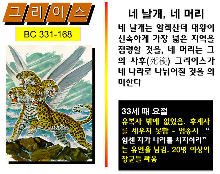 곰의 나라 페르시아를 정복한 머리가 넷이고 날개까지 달린 표범은 빠르고 용맹스러운 알렉산더 대왕이 이끈 그리스이다. 여러분 표범도 빠른 동물인데 이 동물에다가 날개 넷까지 달았으니 얼마나 빠르겠습니까? 이것은 바로 알렉산더 대왕이 신속하게, 빠르게 고대근동의 세계를 점령할 것을 예언한 것입니다. 하나님께서 예언하신 것처럼 알렉산더는 아버지 필립대왕을 이어 20세에 왕위에 올라 기원전 334년, 3만 5천의 소수군대와 1개월 분의 식량만을 가지고 세계 정복에 나서 기원전 332년에 이집트를, 331년에는 숙적인 페르샤를 패망시키고 메대를 점령한 후 인도까지 단숨에 진격하였습니다. 참으로 새처럼 빠르고 표범처럼 용맹한 정복자의 모습이었습니다. 하나님께서 예언한 그대로 이루어졌습니다.
