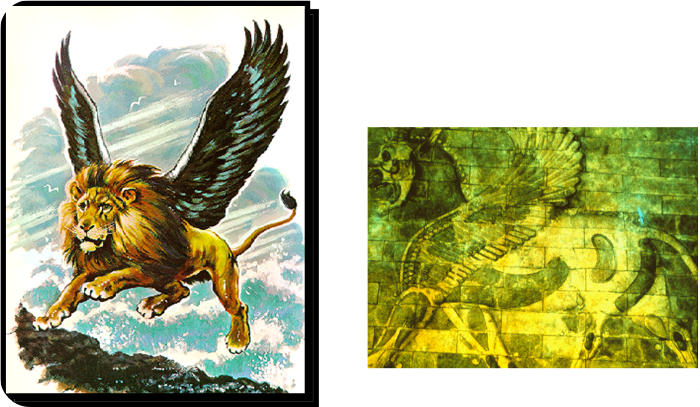 고고학자들이 발견한 바벨론의 성벽과 여러 미술품들을 통하여 바벨론나라가 사자와 독수리로 상징된 나라임을 알 수가 있었습니다. 고대 바벨론은 짐승의 왕인 사자와 새 중의 왕인 독수리의 드높은 기상으로 근동세계를 제패했습니다. 그러나 하나님께서 예언하신대로 다니엘이 보는 앞에서 날개가 뽑히고 앞발이 들리면서 사자의 기개와 용맹을 잃고 문약해지다가 마침내 기원전 539년에 다음 나라 메데와 페르시아의 연합군에 의해서 망하게 됩니다.
