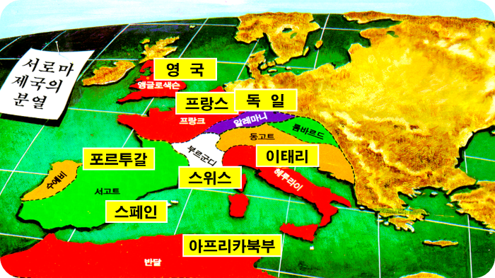 다니엘서 2장을 공부한 여러분들은 벌써 아시겠지요. 다니엘서 2장에 표현된 열발가락으로 상징된 유럽 열나라가 다니엘서 7장에서는 열 뿔로 표현된 것입니다. 로마가 망한 자리에 알레마니, 프랑크, 부르군디, 수에비, 반달, 서고트, 동고크, 앵글로-색슨, 롬바르드, 헤룰리 등으로 정확히 나누어졌습니다.
