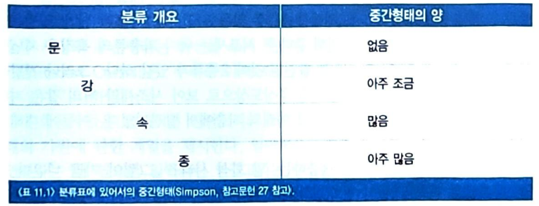 하버드 대학교의 고생물학자 심프슨(George Gaylord Simpson)은 분류 체계의 상위 단계로 올라가면 중간단계의 수가 감소하는 데 대한 문제점을 기술하였다. 그가 평가한 내용을 <표 11.1>에 나타내었다. 2 진화 모델에 따르면, 우리는 중간단계가 없는 주요한 생물 개체군들 사이에서 수많은 중간단계를 볼 수 있어야 한다. 잃어버린 연결고리(missing links)의 문제를 몇 가지 예를 들어 설명하려 한다. 28) 캄브리아기 폭발은 모든 주요 동물문(門)이 지질 주상도상의 같은 곳에서 등장하는 것은 아니다. 캄브리아기 폭발은 생물이 어떻게 어디로부터 진화되었는가를 보여줄 만한 선조나 조상(祖上) 생물이 없는 상황이다. 고생물학자들은 캄브리아기 폭발 바로 아래의 지층, 즉 중간형태를 발견할 것으로 기대되는 암석층을
