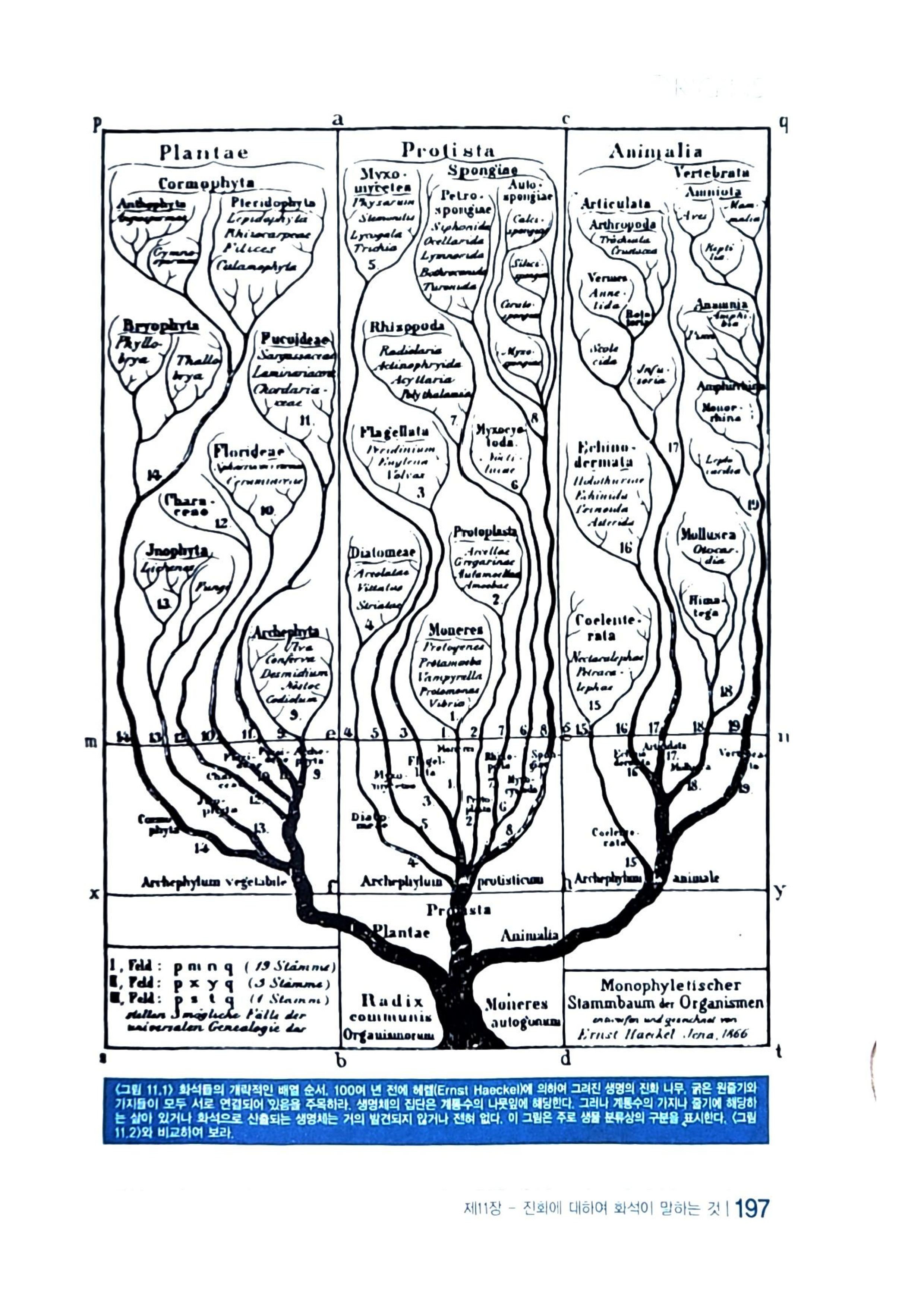 <그림 11.1>은 유럽에서 진화를 열렬히 옹호했던 헤켈(Ernest Haeckel)의 선구자적 업적에 기초한 1886년도 진화 계통수이다. 그림에서 모든 것이 완벽하게 잘 연결되어 있는 것을 보게 된다. <그림 11.2>는 1888년에 작성된 양서류의 화석 기록에 관한 도표이다. 대부분의 개체군 집단이 서로 연결되지 않았음을 주목하기 바란다. 화석집단의 불연속성은 진화가 아닌 창조를 지지한다. 우리는 진화에서는 주요 집단들이 모두가 서로 연결되어 있을 것으로 기대한다. <그림 10.1>은 생물학자들이 생물들을 분류해 놓은 주요 개체군(집단)들을 보여 준다. 만일 진화가 실제로 발생했다면 각 집단은 화석 기록의 하부층에서 발견된 중간형태들을 사이에 두고 서로 연결되어야만 한다. 그러나 다시 말하지만 여기에는 중간형태가 하나도 없다.
