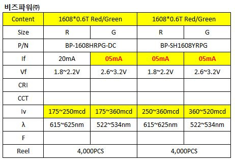 중국 제조회사_1608 dual led : RED/GREEN, 고휘도 LED SPEC 비교