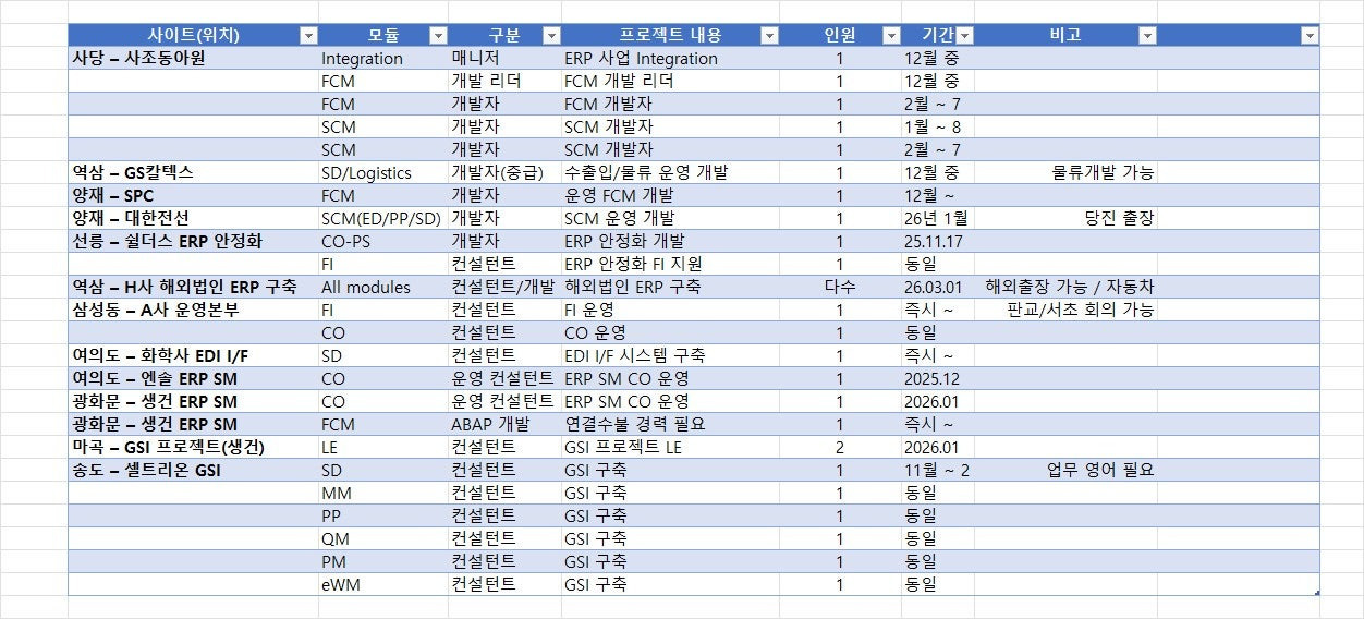 All modules컨설턴트/개발해외법인 ERP 구축다수26.03.01 ~ 27.02.06해외출장 가능 / 자동차 프로젝트 우대