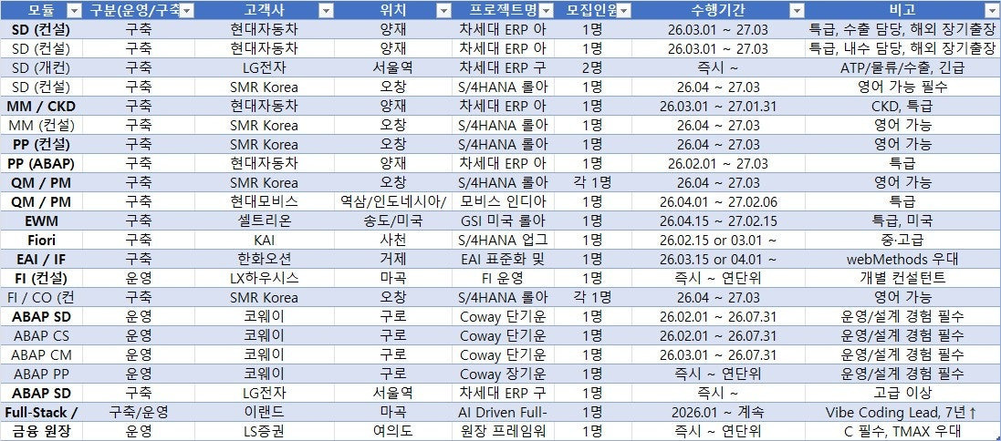 SD (컨설) 구축 현대자동차 양재 차세대 ERP 아태/유럽 구축 1명 26.03.01 ~ 27.03특급, 내수 담당, 해외 장기출장 가능