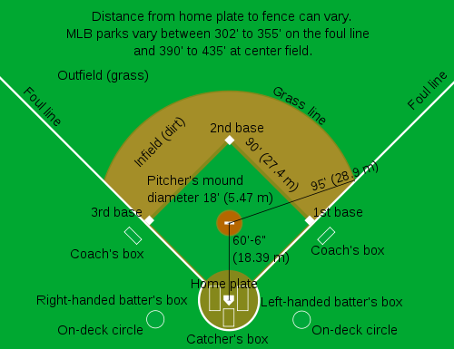 - three-foot line, retaining line 본 루에서 1루까지 거리의 반이 되는 후반 선(last half)으로 1루 파울선과 일치 되어 있다. 타자 주자가 이선의 안쪽 혹은 바깥쪽을 달릴 경우에는 수비방해가 선언될 수 있다.