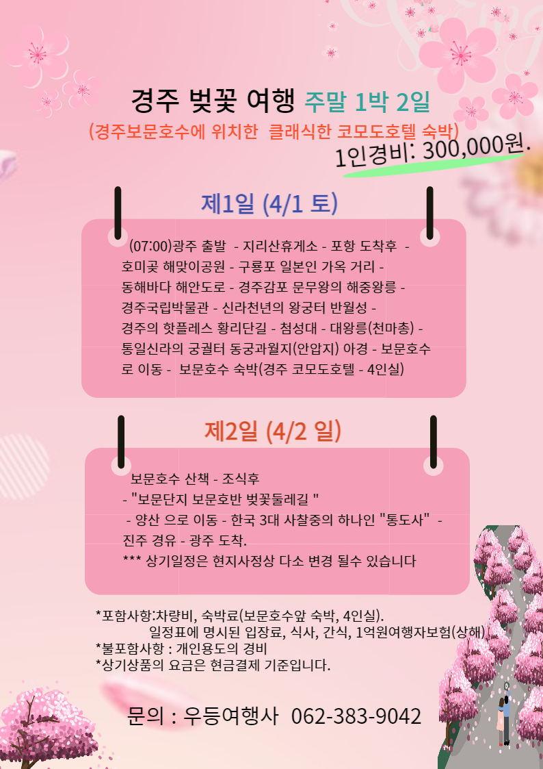 4/1-2 경주벚꽃 주말1박2일 (보문호수 숙박) - 일정취소 -> 4/1(토) 경주변경 작성자오늘도걷는다|작성시간23.02.14|조회수214 목록 댓글 0 글자크기 작게가 글자크기 크게가 다음검색 현재 게시글 추가 기능 열기 북마크 공유하기 신고 센터로 신고 댓글 댓글 0 댓글쓰기 답글쓰기 댓글 리스트