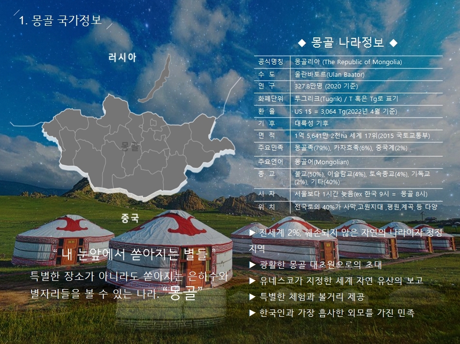 화려한 도시, 푸른 초원, 거대한 호수, 황금빛 사막까지 네 박자를 두루 갖춘 낭만의 나라, 몽골!