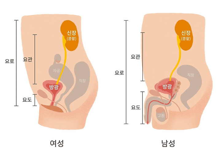 아래 그림처럼 신장, 요관, 방광, 요도 순으로 이어지는 긴 길이라고 생각하면 쉬워요.