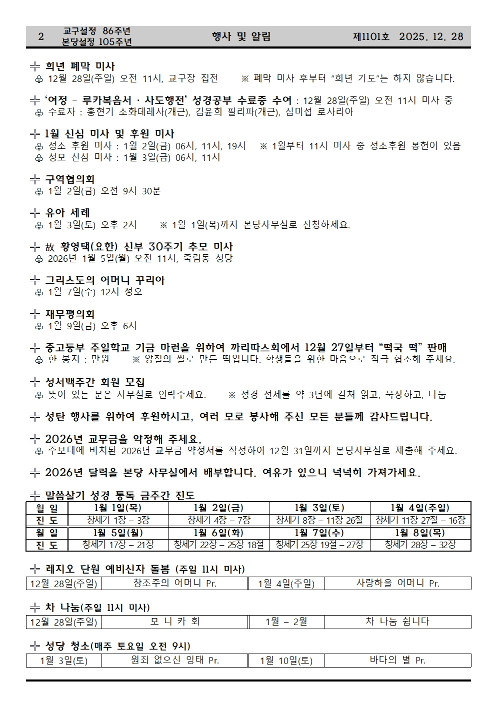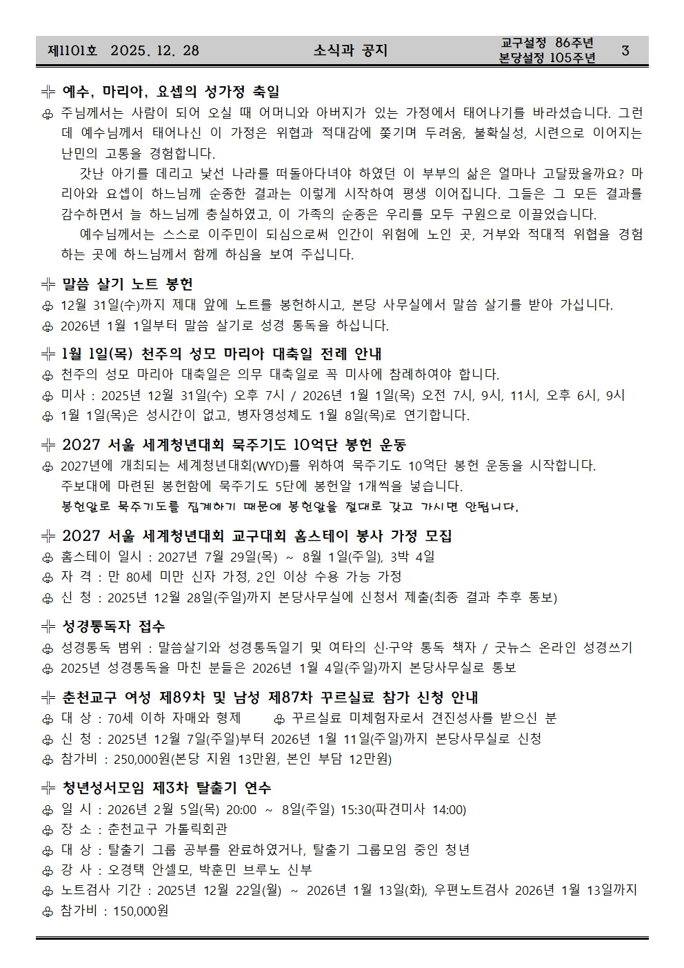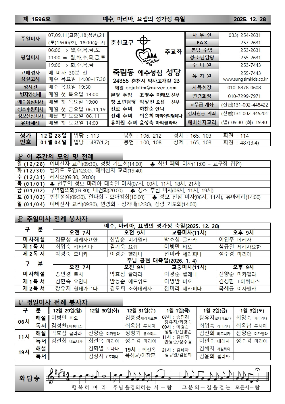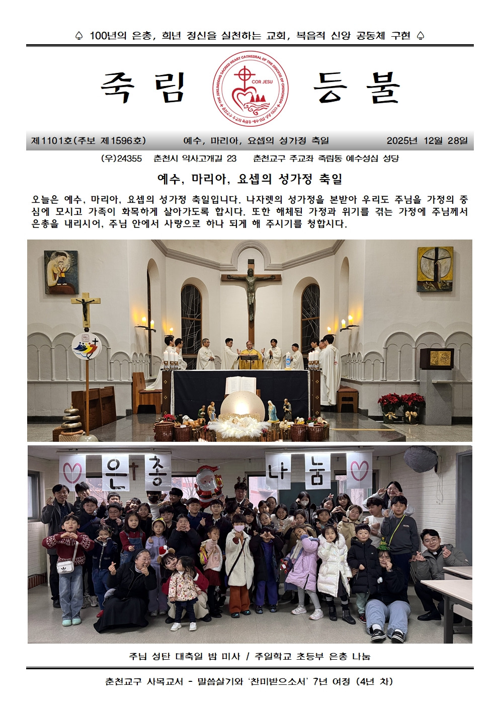 <주보>2025년12월28일 죽림등불제1596호 예수,마리아, 요셉의성가정축일 작성자ulso|작성시간25.12.26|조회수166 목록 댓글 0 글자크기 작게가 글자크기 크게가 다음검색 현재 게시글 추가 기능 열기 북마크 공유하기 신고 센터로 신고 댓글 댓글 0 댓글쓰기 답글쓰기 댓글 리스트