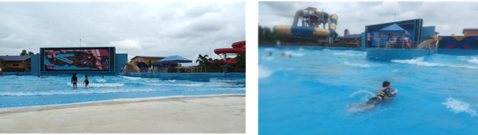 파도풀장에서 놀고 있는 사람들의 모습을 비춰줍니다!