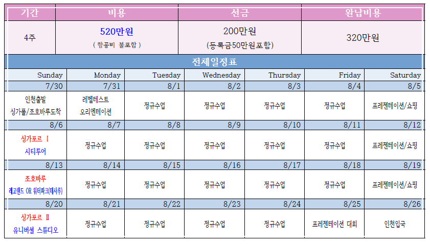 캠프 비용 : 4주 520만원 (항공불포함)