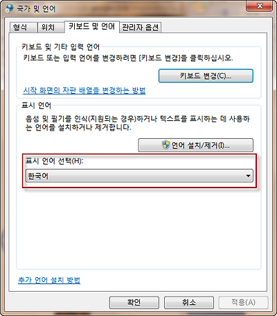 1. 우선 자신의 설치된 윈도우에 선택을 할 수 있는 언어가 무엇인지 확인을 합니다. 바탕화면에서 ‘시작 버튼' → '제어판' → '시계, 언어 및 국가별 옵션’ → '국가 및 언어'를 선택하고 '키보드 및 언어' 탭 선택을 하신 후 '표시 언어 선택'의 화살표를 누르시면 현재 윈도우에서 변경이 가능한 언어의 목록을 보실 수 있습니다. 대부분 한국어 하나만 있습니다.