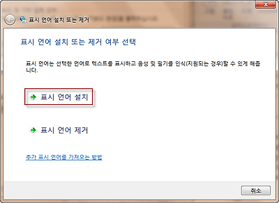 3. 원하는 언어팩이 없으면, '언어 설치 제거' 버튼을 클릭하십시오. '표시 언어 설치 또는 제거' 창문이 열리고 '표시 언어 설치'를 클릭하십시오.