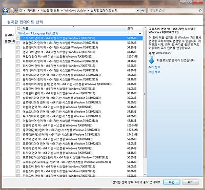7. 아래의 그림과 같이 '윈도우7 언어팩'의 목록이 보입니다. 그 중에 원하시는 언어팩을 선택하시고 '확인' 버튼을 누르면 다운로드가 됩니다. 다운로드가 완료되면 파일을 더블 클릭하여 실행을 시키시고, 설치가 완료되면 1번에 있던 화면에서 설치한 언어로 변겨을 하고, 로그인을 다시 하시면 바뀐 언어로 윈도우가 실행이 됩니다.