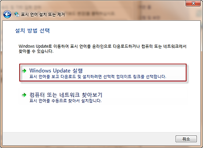 4. 아래와 같이 열린 창문이 변하면서 2가지의 방법으로 설치가 가능합니다. '윈도우 업데이트 실행'은 마이크로소프트홈페이지에서 해당언어 팩을 다운로드 하여 설치를 하며, '컴퓨터 또는 네트워크 찾아보기'는 멀티랭귀지 팩이 있는 윈도우설치CD에서 하실 수 있습니다. 만약 윈도우설치CD에 없다면 업데이트를 이용하시면 됩니다. 여기서는 업데이트 방법을 이용하면 설명을 드리겠습니다. 우선 '윈도우 업데이트 실행'을 누르세요