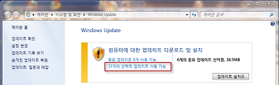 6. 잠시 시간이 흐르면 가능한 업데이트 목록이 아래와 같이 나옵니다. '중요업데이트'와 '선택적 업데이트'가 있습니다. 언어팩은 '선택적 업데이트'에 있습니다. 따라서 '33개의 선택적 업데이트 사용가능'을 클릭하십시오. 숫자는 다르게 나올것입니다.