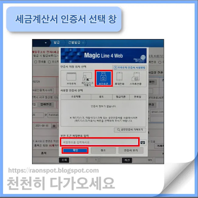 세금계산서 발행 방법은 기존과 동일하며 마지막에 공인인증서가 아닌 보안카드의 번호를 입력해서 발급하는 방법으로 세금계산서를 발행하시면 됩니다. 세금계산서 발행 시 뜨는 인증서 선택 창에서 보안토큰을 선택해 주세요.