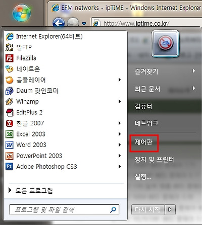 (1) 윈도우의 [시작] 버튼을 클릭 후 [제어판] 항목을 클릭합니다.