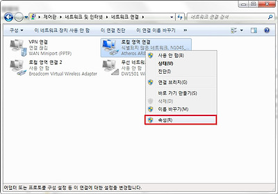 (8) [로컬 영역 연결] 아이콘을 클릭 후 마우스 오른쪽 버튼을 클릭하여 [속성] 메뉴를 클릭합니다.