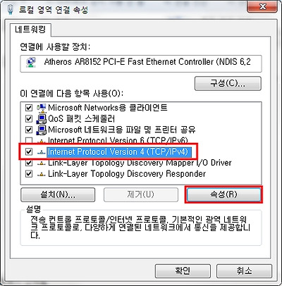 (9) [Internet Protocol Version 4(TCP/iPv4)] 항목을 클릭 후 [속성] 버튼을 클릭합니다.