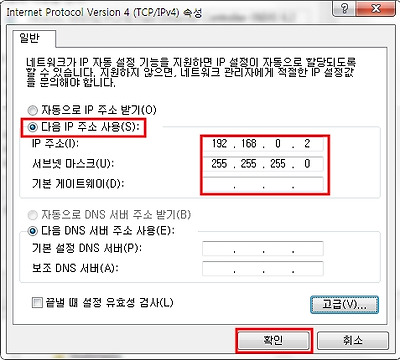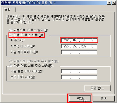 (3) [다음 IP 주소 사용]을 선택하신 후 수동으로 IP를 192.168.0.2로 입력하고, [확인]버튼을 클릭하여