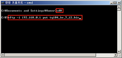 "tftp -i 192.168.0.1 put {펌웨어 파일명}"을 입력하고 엔터를 입력합니다.