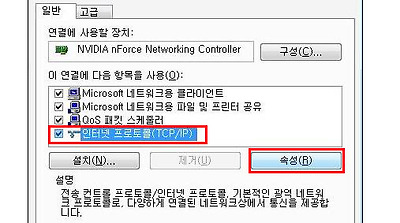 (2) 로컬영역 연결 속성 창에서 [인터넷 프로토콜 (TCP/IP)]선택 후 속성을 누릅니다.