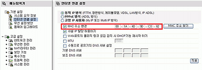 메뉴에서 아래 화면의 붉은 네모와 같이 [MAC 주소 변경]을 체크 후 [적용]버튼을 클릭합니다.