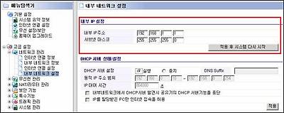[고급설정]-[네트워크 관리]-[내부 네트워크 설정] 메뉴에 접속합니다.