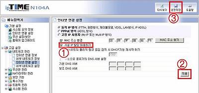 클릭하시고, [기본설정]-[인터넷 연결 설정] 메뉴에 접속하여 아래와 같이 [사설IP할당 허용하기] ①