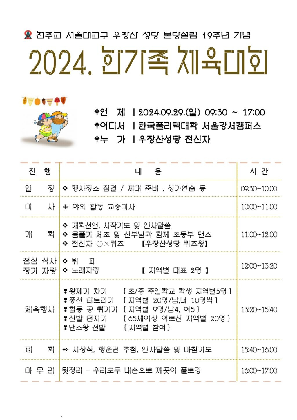 한가족 체육대회 안내 작성자정만영요셉|작성시간24.09.25|조회수193 목록 댓글 0 글자크기 작게가 글자크기 크게가 1. 체육대회 일정표2. 주일미사 안내3. 시상 안내 등 다음검색 현재 게시글 추가 기능 열기 북마크 공유하기 신고 센터로 신고 댓글 댓글 0 댓글쓰기 답글쓰기 댓글 리스트