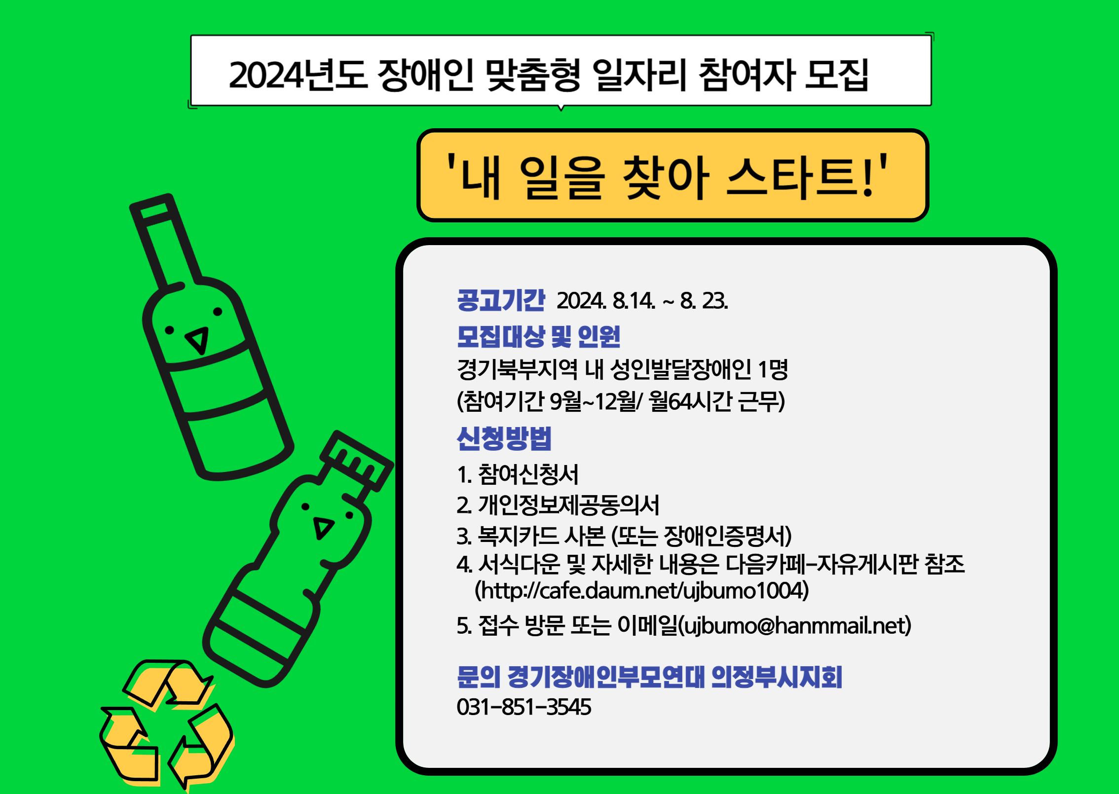 | 2024년 경기도 맞춤형 장애인일자리 참여자 모집 경기장애인부모연대 의정부지부에서는 중증발달장애인의 사회참여 확대 및 소득보장 지원을 위한 맞춤형직무를 개발하여 노동의 주체로서 지역사회에 능동적인 역할을 수행 할 경기도 맞춤형 장애인일자리 참여자를 다음과 같이 공개모집 하오니 많은 지원 바랍니다. ‘내 일을 찾아 스타트!’ 참여자 모집 1) 사 업 명 : 2024년 장애인 맞춤형일자리 2) 근무기간 : 2024년 9월 ~ 2024년 12월(4개월) 3) 공고기간 : 2024년 8월 14일 ~ 8월 23일 (*면접일: 서류합격자는 개별연락) 4) 신청자격 : 경기북부지역 등록 성인 발달장애인 ◼실내외 프로그램 참여 가능한 성인발달장애인 ◼플로깅(걸으면서 쓰레기줍기) 활동 참여 가능한 성인발달장애인 5) 모집인원 : 1명 (경기북부지역 내 성인발달장애인) 6) 근무장소 : 경기장애인부모연대 의정부시지회(의정부시 효자로 14 e프라자 3층) 7) 수행직무: ◼환경보호 및 캠페인 활동 (플로깅, 재활용 분리 및 수거, 리사이클링 및 업사이클링) ◼문화예술활동 운영(음악 및 미술 교육, 작품활동) ◼장애인인식개선 캠페인 등을 통한 발달장애인에 대한 인식개선활동 8) 근무여건 1.근무유형: 월 64시간 근무, 1명(주 16시간) ◼시간: 월요일~ 목요일 오후3시~오후6시 금요일 오후 1:30~오후6시 ◼급여 : ₩828,240원 (세전) 2. 공통사항 ◼단체 활동 시 탄력적 운영 예정 ◼4대보험 가입, 주휴수당, 연차 9) 제출서류 : 1. 참여신청서, 2. 개인정보제공동의서 1부 (서식 다운 http://cafe.daum.net/ujbbumo1004 - 자유게시판) 3. 복지카드 사본 (또는 장애인증명서) 10) 접 수 처 : 방문 또는 이메일(ujbumo@hanmail.net) ) 접수 ※ 기타 문의사항: 031-851-3545, 경기장애인부모연대 의정부시지회 |