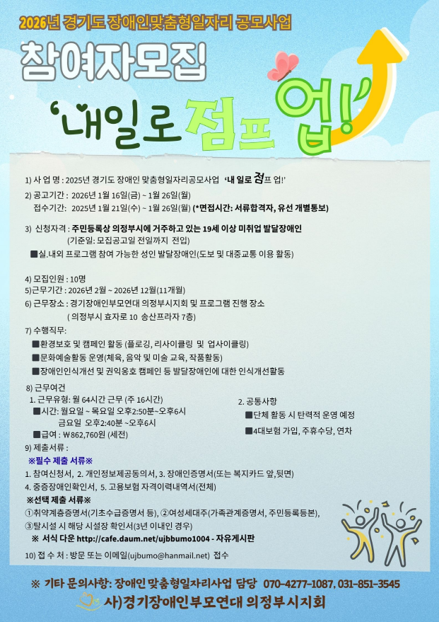 2026년 경기도 장애인맞춤형일자리 공모사업 참여자 모집 작성자새누리장애인부모연대의정부|작성시간26.01.16|조회수233 목록 댓글 0 글자크기 작게가 글자크기 크게가 26_1서식2-2_ 참여신청서.hwp72.50KB26_2서식3_개인정보동의서.hwp80.50KB26_3서식5_ 참여자정보확인서.hwp56.00KB26_4서식7_ 부모동의서.hwp41.00KB 첨부파일첨부된 파일이 5개 있습니다. png 파일 image.png 다운로드 hwp 파일 26_1서식2-2_ 참여신청서.hwp 다운로드 hwp 파일 26_2서식3_개인정보동의서.hwp 다운로드 hwp 파일 26_3서식5_ 참여자정보확인서.hwp 다운로드 hwp 파일 26_4서식7_ 부모동의서.hwp 다운로드 다음검색 현재 게시글 추가 기능 열기 북마크 공유하기 신고 센터로 신고 댓글 댓글 0 댓글쓰기 답글쓰기 댓글 리스트