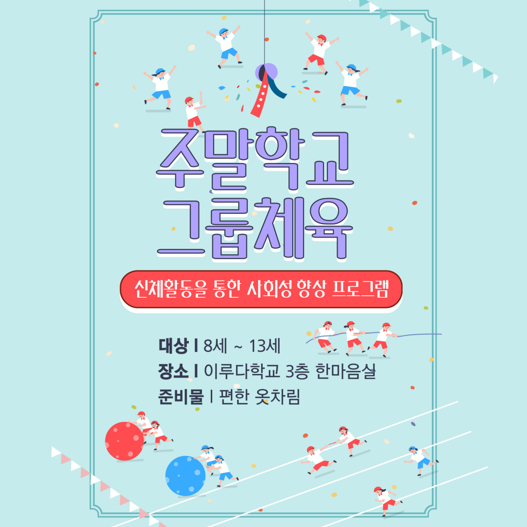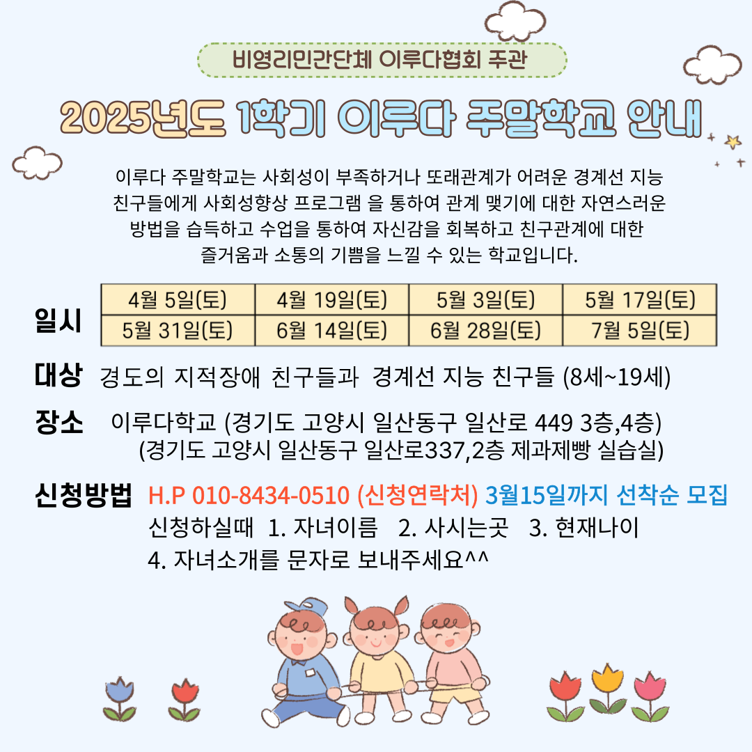 2025년 이루다주말학교 1학기 모집안내 작성자원준맘|작성시간25.02.28|조회수26 목록 댓글 0 글자크기 작게가 글자크기 크게가 다음검색 현재 게시글 추가 기능 열기 북마크 공유하기 신고 센터로 신고 댓글 댓글 0 댓글쓰기 답글쓰기 댓글 리스트