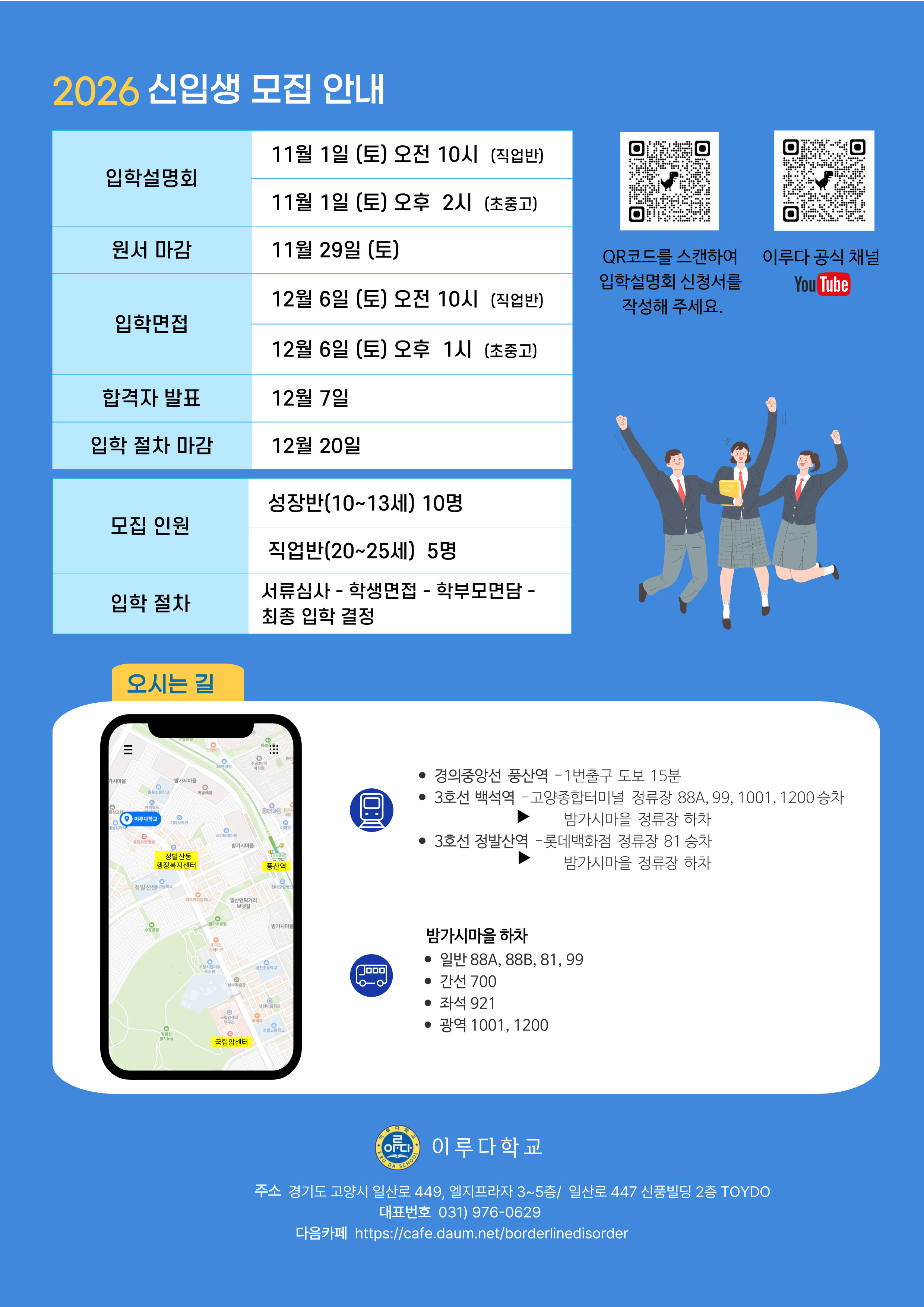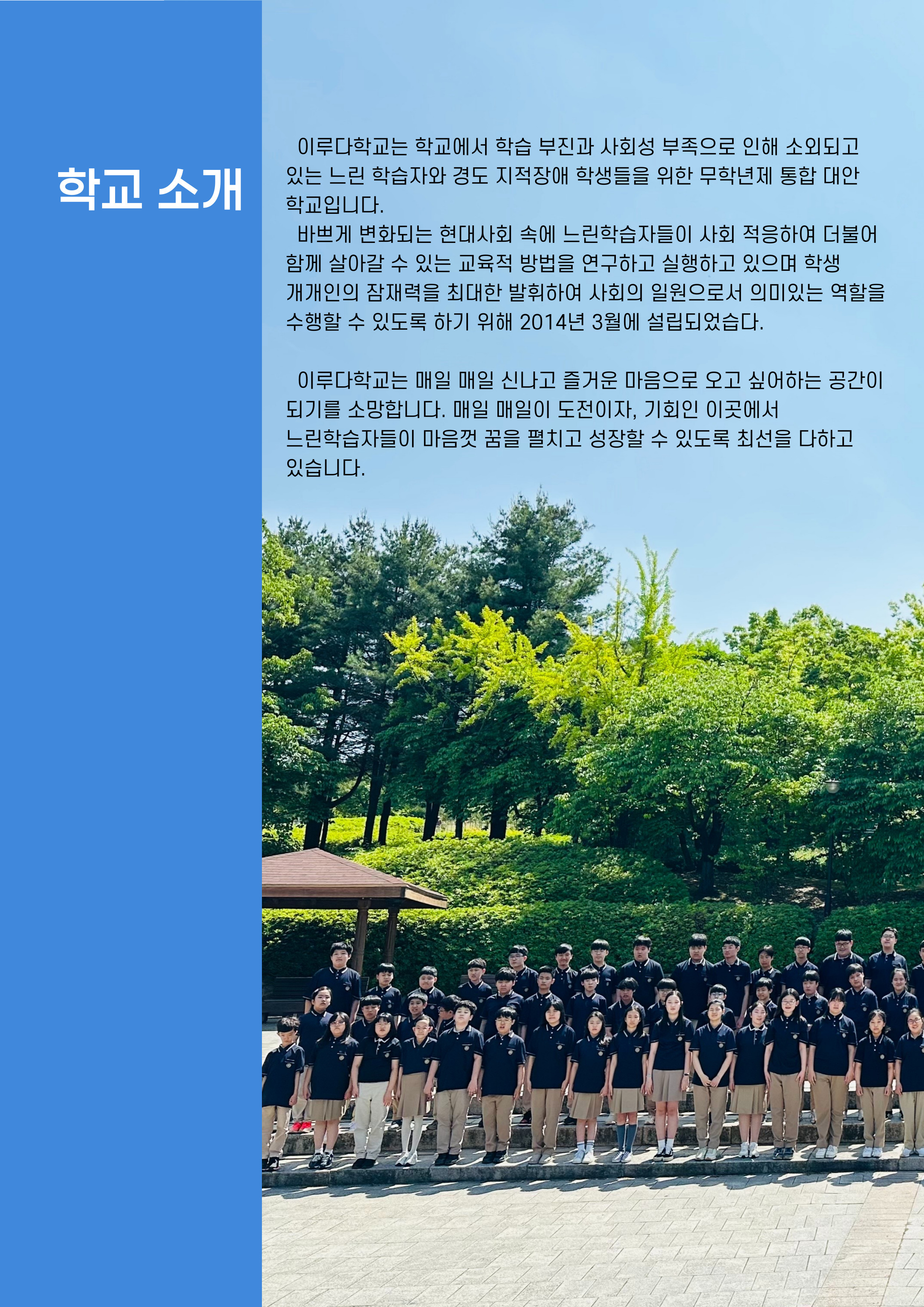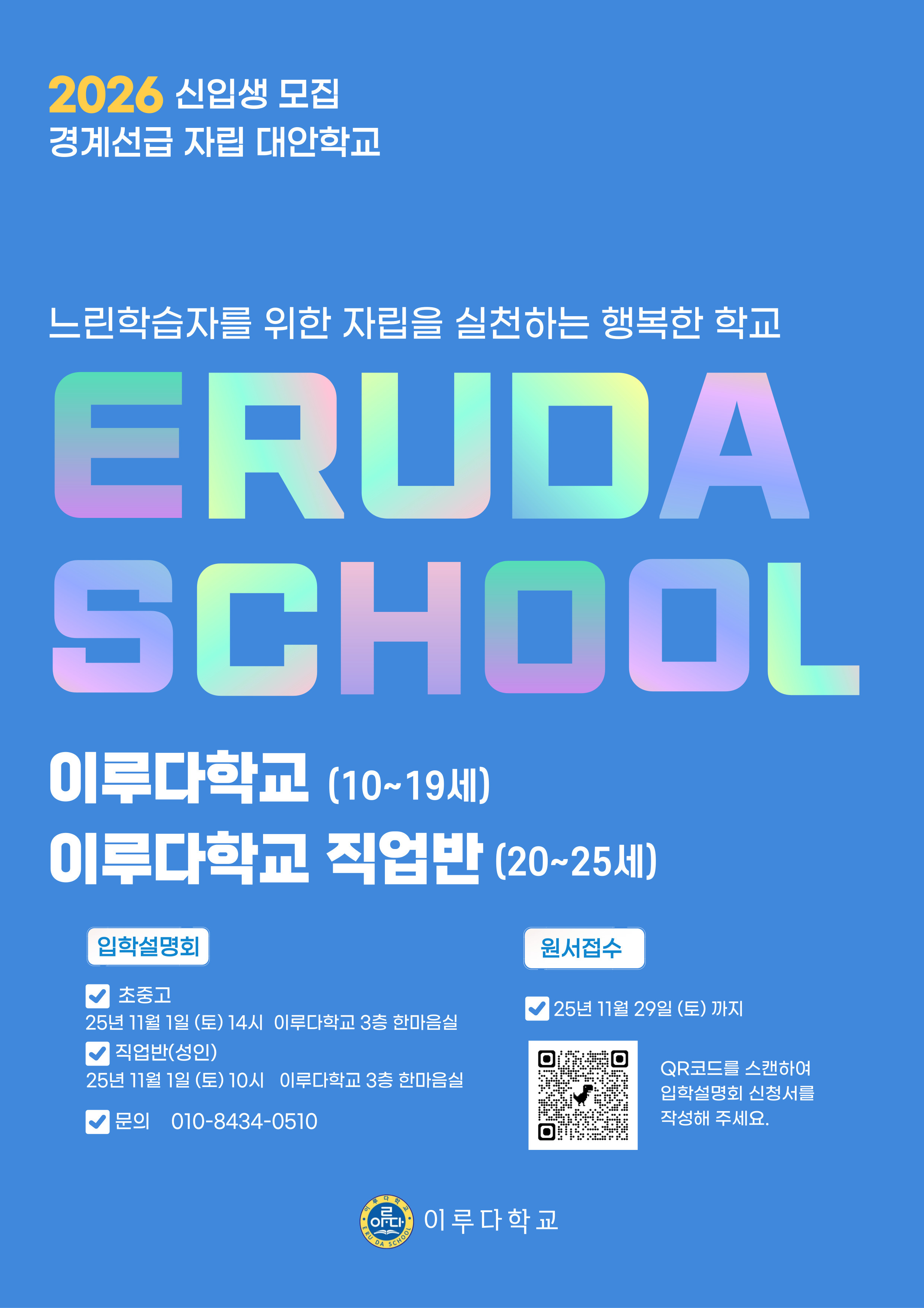 안녕하세요 느린학습자들의 행복한 자립생활을 실천하는 이루다학교가 2026학년도 입학설명회를 개최하오니 관심가져주시고 참여해주세요^^