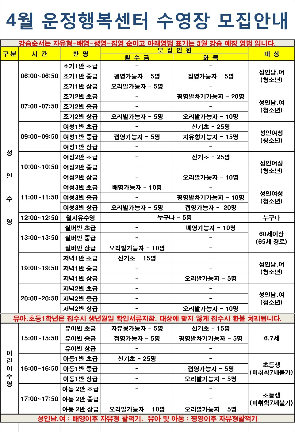 4월 운정행복센터 수영장 신규모집 안내 작성자MJ|작성시간14.03.21|조회수1,002 목록 댓글 0 글자크기 작게가 글자크기 크게가 다음검색 현재 게시글 추가 기능 열기 북마크 공유하기 신고 센터로 신고 댓글 댓글 0 댓글쓰기 답글쓰기 댓글 리스트