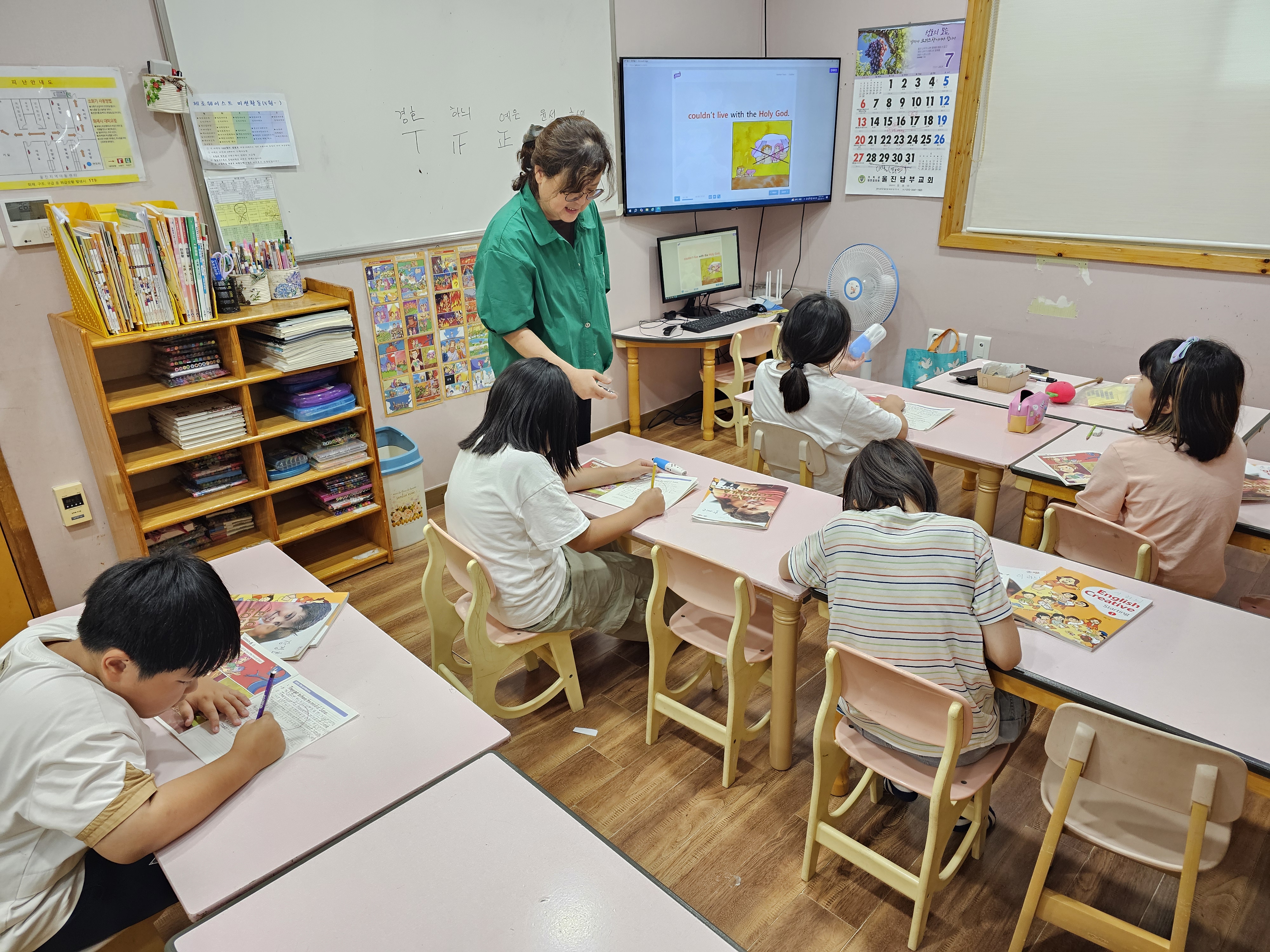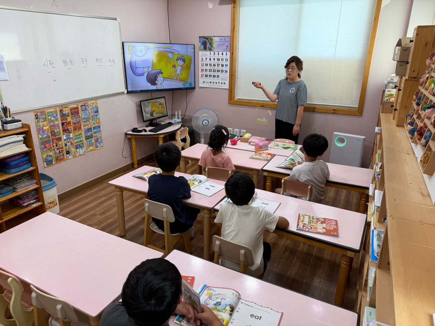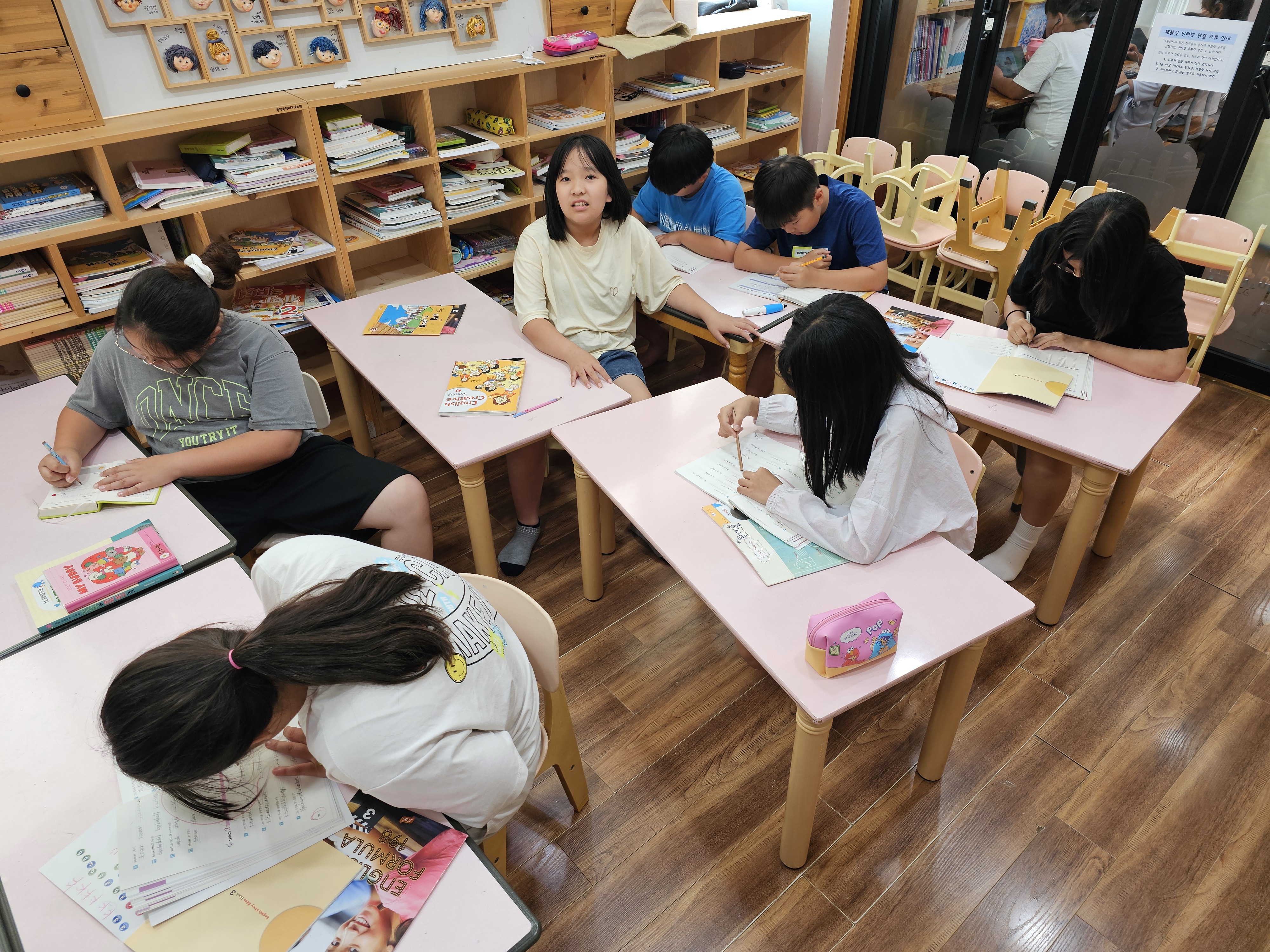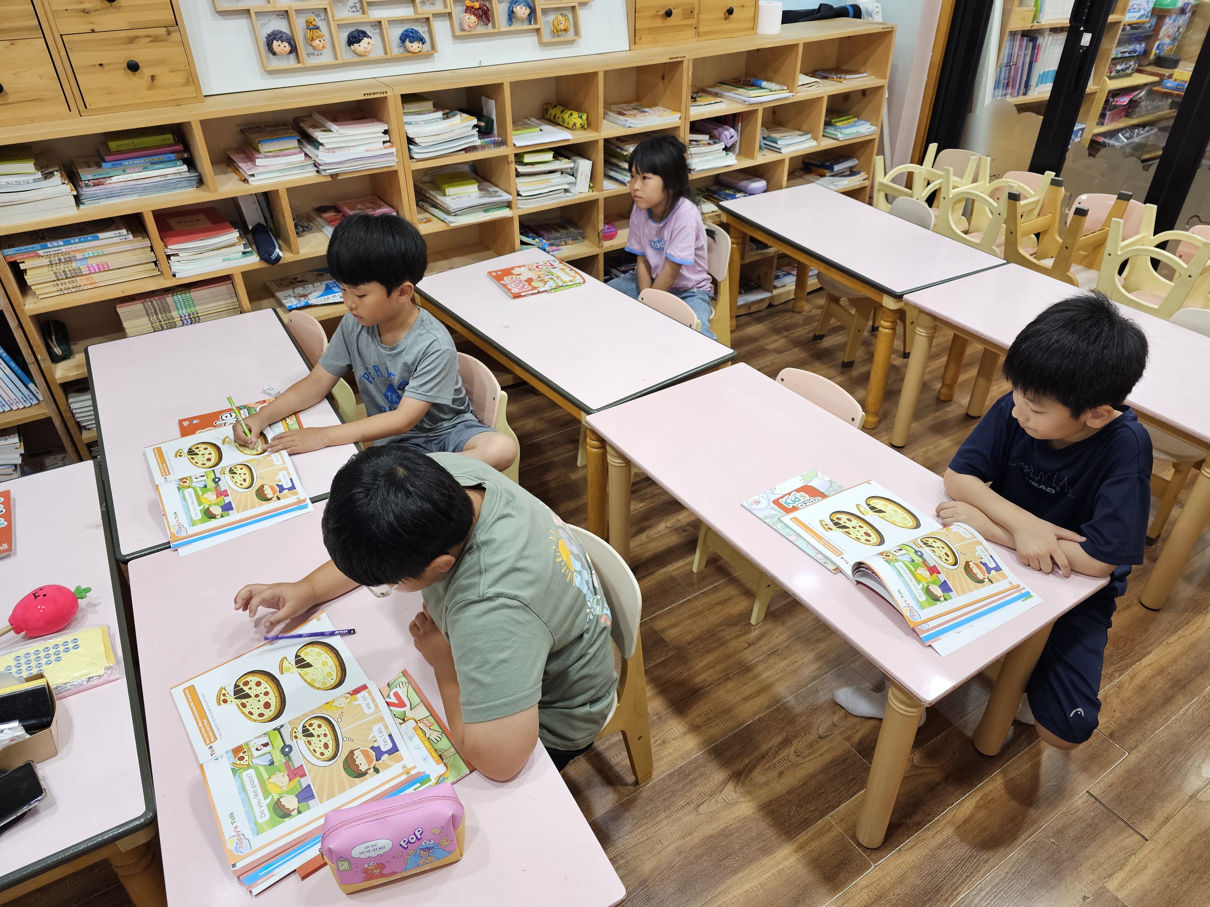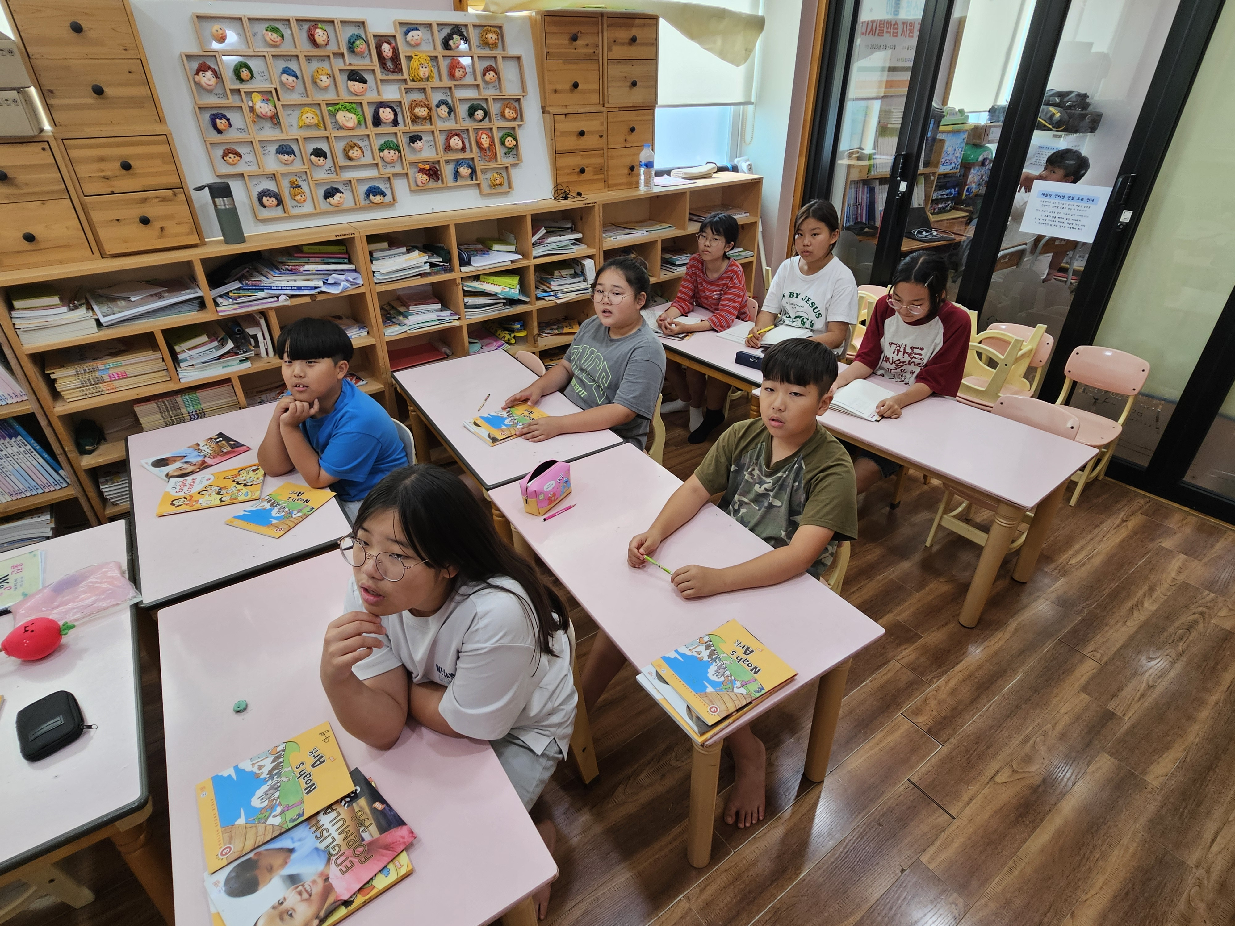 선생님과 같이 영어를 따라 하기도 하고 적으면서 열심히 영어 발음을 익히는 아이들입니다.